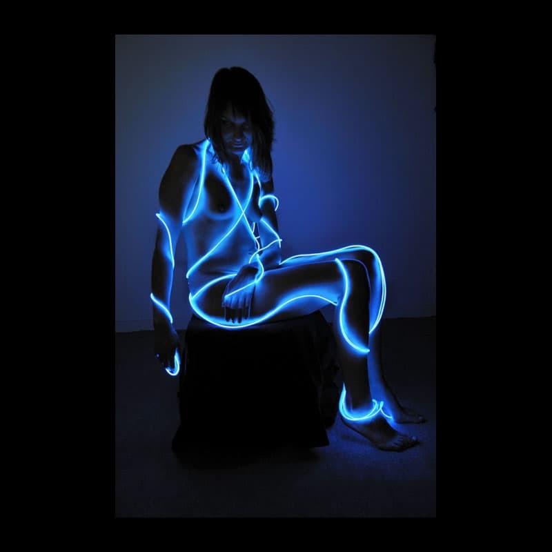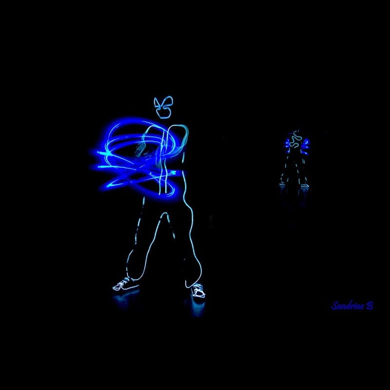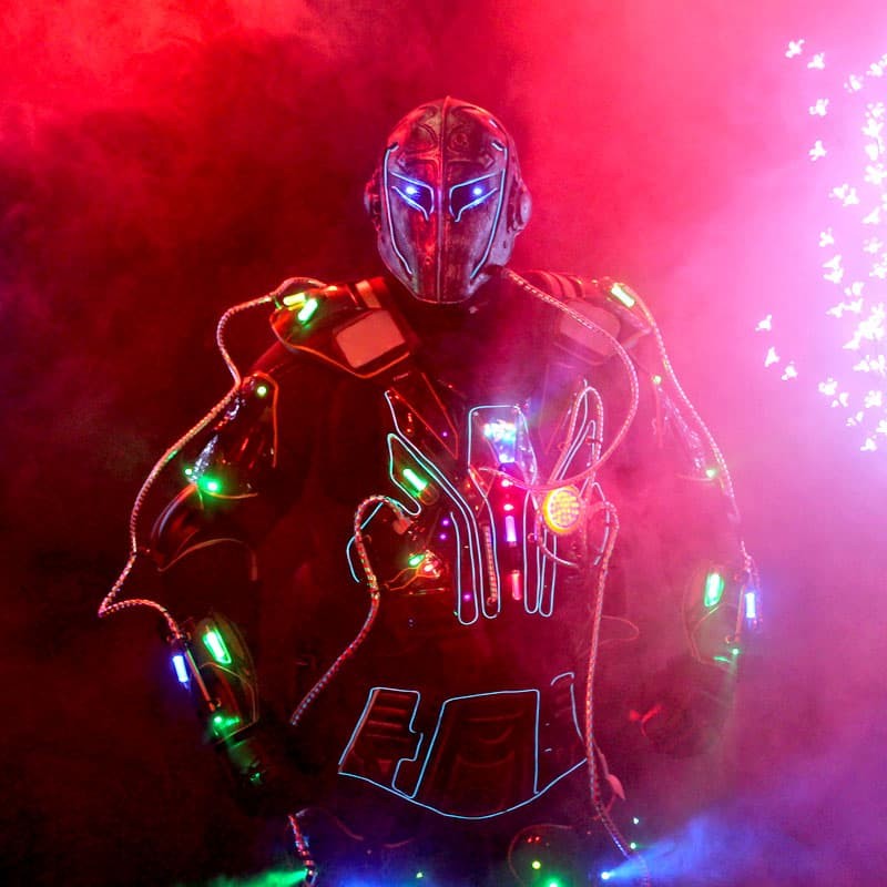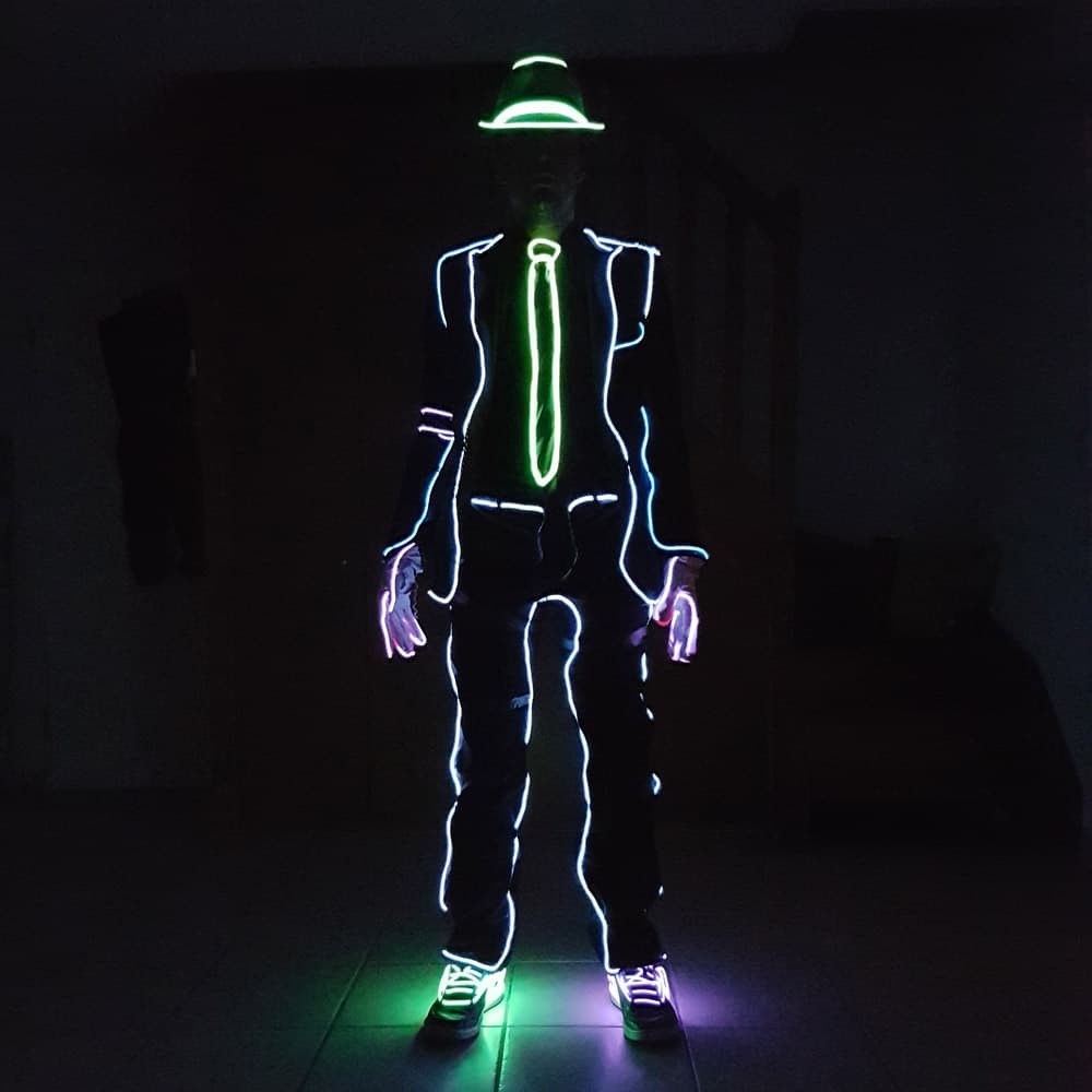 Lichtkostüm und Roboter aus elektrolumineszentem Lichtdraht